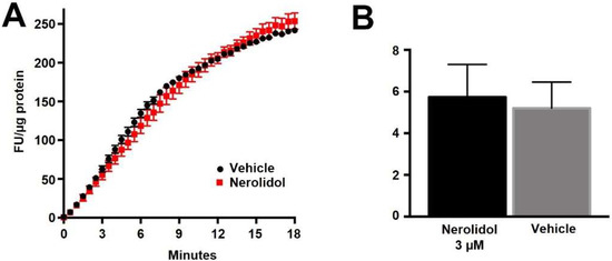 Nerolidol does not alter the basal activity of DAGLα. (A) Sample Enzchek lipase activity time course in the presence of vehicle (black) or nerolidol (3 μM, red) in DAGLα-transfected CHO cells. (B) Summarized results show lipase activity in DAGLα-expressing CHO cells in response to vehicle or nerolidol (n = 3).
