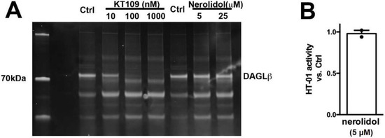We additionally tested DAGLβ activity in brain tissue using HT-01, a probe developed to characterize DAGLβ activity [32]. We found that while the DAGLβ blocker KT109 competes with HT-01 for binding at DAGLβ, nerolidol does not (Figure 5, nerolidol (5 μM) relative to vehicle (1.0 = no effect): 0.98 ± 0.04; n = 2, NS by 1-tailed t-test vs. 1.0, p = 0.70). Thus, nerolidol does not appear to inhibit either DAGL.