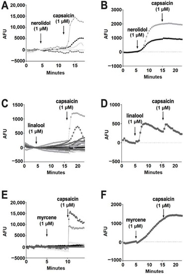 2.3. Myrcene, Nerolidol, Linalool, Pinene and Limonene Do Not Consistently Activate TRP Channels in Dorsal Root Ganglion Neurons
