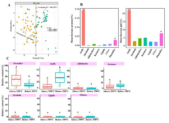 Figure 3. Effect of pyrolysis temperatures on PA components. (A) PLS-DA analysis of pyrolysis liquid compositions from different pyrolysis temperatures. (B) relative importance of pyrolysis liquid compositions in different pyrolysis temperatures. * indicated p < 0.05, ** indicate p < 0.01. The out-of-bag error rate of RF model was 12.5%. (C) The distribution of phenolics, acids, ketones, alcohols, lipids, aldehydes and others relative content at different pyrolysis temperatures. p < 0.05.