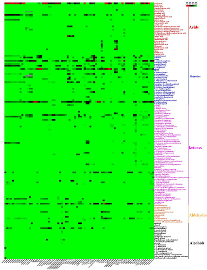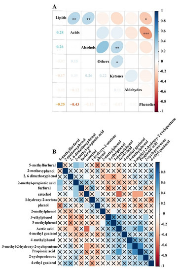 Phenolics, acids, aldehydes, ketones, alcohols, lipids and others were assessed by the correlation analysis. The results demonstrated a significantly negative correlation between acids and phenolics (r2 = −0.43, p < 0.001) and a significantly positive correlation between acids and lipids (r2 = 0.28, p < 0.05). In addition, ketones significantly positively correlated with alcohols (r2 = 0.26, p < 0.05) (Figure 5A).