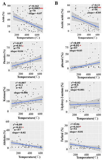 The regression analysis showed that pyrolysis temperatures had a significantly negative linear relationship with acids (slope = −0.07, r2 = 0.162, p = 0.0001) and aldehydes (slope = −0.02, r2 = 0.09, p = 0.01) and a significantly positive linear relationship with phenolics (slope = 0.04, r2 = 0.07, p = 0.01) (Figure 6A). Meanwhile, pyrolysis temperatures also had a significantly negative linear relationship with the PA compounds of acetic acids (slope = −0.05, r2 = 0.12, p = 0.005) and furfurals (slope = −0.01, r2 = 0.06, p = 0.03) and a significantly negative linear relationship with phenols (slope = 0.03, r2 = 0.09, p = 0.01) (Figure 6B). These results indicated that pyrolysis liquids components were affected by pyrolysis temperatures during the pyrolysis.