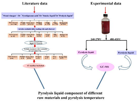 In our experimental data, the pyrolysis liquid was produced from eucalyptus with a traditional black charcoal kiln and collected by using running water through a shuttle, to condense the smoke, PA were collected from a temperatures range at two different temperatures ranges (240–270 °C and 400–420 °C). The GC–MS analysis of the PA sample was conducted by Shimadzu GCMS-QP2010 Plus (Shimadzu, Japan) at an ionization voltage of 70 eV and an electron multiplier and transfer line temperature of 220 °C on an HP5-MS capillary column (100 m × 0.25 mm i.d, 0.25 µm film thickness). The temperature program was as follows: 40 °C for 2 min, then increased at a rate of 1 °C/min to 70 °C and held for 10 min, was further increased at a rate of 5 °C/min to 260 °C, and was then held constant at 260 °C for 8 min. Other detailed GC–MS parameters were as follows: injection temperature, 200 °C; ion source temperature, 200 °C, carrier gas, Helium at 1.0 mL/min; injection volume 1.0 µL; and mass range m/z 40–500. The identification of chemical organic compounds was based on the comparison of the experimental data with the NIST library database. A flow chart of pyrolysis liquid data from the scientific databases and experimental data, respectively, is depicted in Figure 7.