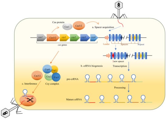 The clustered regularly interspaced short palindromic repeats (CRISPR)-Cas system is an acquired immune system widely present in the genomes of archaea (~90%) and bacteria (~40%), which acts as a defense mechanism against the invasion of exogenous nucleic acids, such as phages and plasmids []. The details of how the CRISPR-Cas system provides immunity are shown in Figure 1. CRISPR-Cas system consists of the CRISPR arrays, leader sequences, and CRISPR-associated (cas) genes (Figure 1). CRISPR arrays consist of small direct repeats, which are separated by similarly sized spacers. There are 4–10 highly conserved cas genes encoding Cas proteins adjacent a CRISPR array []. Recent studies have shown that the CRISPR-Cas9 editing system can be used to target drug-resistant genes to reverse antibiotic resistance []; metastasis of the CRISPR array targeting chromosomal regions relevant to antibiotic resistance results in the death of the recipient bacteria []. In A. baumannii, the classification of the CRISPR-Cas system is generally type I-F [].
