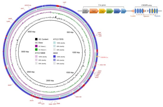 The CRISPR-Cas system of AB43 was detected by CRISPRCasFinder(https://crisprcas.i2bc.paris-saclay.fr/CrisprCasFinder/Index, accessed on 18 June 2018) in the CRISPRCasdb, including repeat and spacer sequences []. The targets of spacer sequences were explored by taking advantage of the CRISPR Target (http://crispr.otago.ac.nz/CRISPRTarget/crispr_analysis.html, accessed on 2 March 2022) []. The genome data of reference strains used for circular comparison were downloaded from NCBI, including the A. baumannii strains ATCC19606 and ATCC17978.