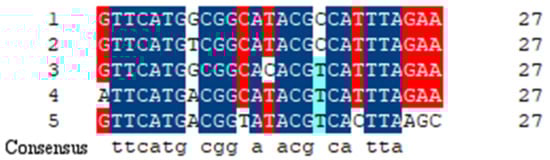 Nucleotide sequence alignment of the five different repeat sequences. The “consensus” line represents the same nucleotide.
