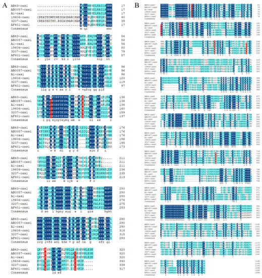 Alignment of Cas1 (A) and Cas3 (B) amino acid sequences of the Acinetobacter baumannii type I-Fb CRISPR-Cas system-containing strains (AB43, AB0057, R2091, 5075UW, AB307-0294, ATCC BAA1605, CIP70.10, AC1633, AYE, D36, AB0057, and A1) and type I-Fa CRISPR-Cas system-containing strains (ATCC19606, 3207, A1429, 103, 104, 736,7835, AB3207, DETAB-P2, B8300, and AF401). The “consensus” line represents the same amino acid with the reference sequence.