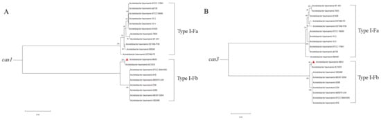 In this study, we conducted a WGS of the A. baumannii strain AB43, which contains a type I-Fb CRISPR-Cas system and is sensitive to most antibiotics. To date, the CRISPR-Cas system has been divided into two main classes: class 1, including the type I, III, and IV systems, and class 2, including type II, V, and VI systems. In total, there are 33 different subtypes []. Kate et al. analyzed the WGS of most A. baumannii strains published on NCBI, and 15.7% of the strains carried the CRISPR-Cas system of type I-Fb, the most common subtype []. Cas proteins are encoded upstream of the CRISPR array and determine the system type [,]. Thus, multiple sequence alignments and phylogenetic tree analyses of cas1 and cas3 were examined in our study. All types of CRISPR-Cas systems have the cas1 gene, but the cas3 gene is a type I CRISPR-Cas system-specific marker. The Cas3 domains may promote similar ‘primed’ spacers integrated into the subtype I-F systems []. Compared with the I-Fb CRISPR-Cas system, the I-Fa CRISPR-Cas system lacks the csy1 []. Alignment of Cas1 and Cas3 amino acid sequences of A. baumannii strains with different types of CRISPR-Cas systems showed low identity (Figure 4), and alignment of different subtypes alone showed high identity (Figure S1). This is consistent with the fact that the typing of the CRISPR-Cas system is based on the Cas protein sequences. According to the phylogenetic analysis, we found that cas genes were highly specific in different CRISPR-Cas subtypes but conservative in the same subtype. Our analysis showed that the sequence type of AB43 is ST132, based on the Pasteur protocol, and this ST belongs to CC132 that carries the OXA-120 allele []. The presence of OXA-120 gene in Table 2 also verified that the typing was correct.