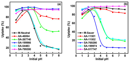 Batch experiments were conducted to verify the usefulness of some commercial alumina for CA-99Mo sorption from aqueous solutions. In order to design a successful sorption process, investigating the optimum pH is of crucial concern. The solution pH mainly governs the sorption behavior, as it controls the existing Mo species in the solution and the degree of charge that appears on the sorbent surface [30]. To demonstrate the influence of solution pH on the efficiency of the sorption process, equilibrium studies were conducted at a pH ranging from (1 to 8). The results presented in Figure 1a,b display the uptake of CA-99Mo on different commercial alumina as a function of solution pH. Optimal uptake values are observed at an initial pH of around 3. Beyond this value, it can be seen that Mo uptake starts either to decrease very slightly (almost consistent) for M-Sauer, AA-11501, AA-46064, SA-199966, SA-517747 and SA-799300, or sharply, in the case of M-Neutral, AA-11502, SA-267740, SA-769290, SA-199974 and SA-544833. This behavior can be explained based on determining the surface charge of the solid phase and the distribution of the molybdate species in the solution.
