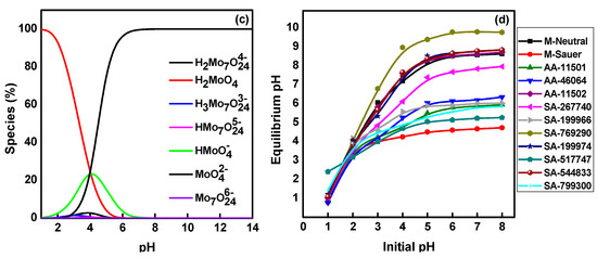 Effect of initial pH (a,b) on the uptake of CA-99Mo on different alumina adsorbents (Co = 50 mg/L, V/m = 100 mL/g, and temperature = 25 ± 1 oC), (c) speciation of molybdenum, and (d) variation of the equilibrium pH values.