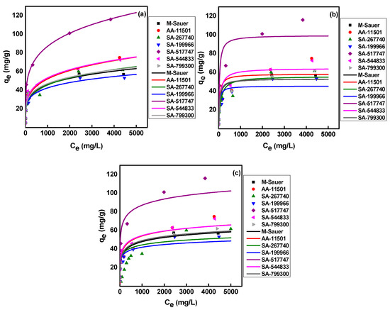 These results indicate that adsorption of CA-99Mo on the sorbents (AA-11501, SA-267740, SA-199966, SA-517747, and SA-544833) occurred mainly through multilayer adsorption at heterogeneous surfaces [39,44]. The Freundlich adsorption constant (nf) represents the adsorption intensity, for example: (i) nf < 1 (a chemical process), (ii) nf = 1 (linear adsorption), and (iii) nf > 1 (physisorption) [44]. The nf values presented in Table 2 are higher than 1, indicating that the CA-99Mo adsorption on commercial alumina sorbents used in this study was physisorption and favorable under the current experimental conditions. In addition, the closer the 1/n values are to 0 than to unity (ranging from 0.19 to 0.25), the more heterogeneous the surface is, implying a broad distribution of adsorption sites on the adsorbent surface [33,38]. Furthermore, Mo(VI) adsorption onto M-Sauer and SA-799300 shows a higher correlation with the Temkin model. This finding suggests that the reaction occurs in heterogeneous multilayer adsorption with a decrease in the heat of adsorption with increasing the overlap degree with Temkin constant (AT) 1.57 and 1.98 L g−1 for M-Sauer and SA-799300 adsorbents, respectively.