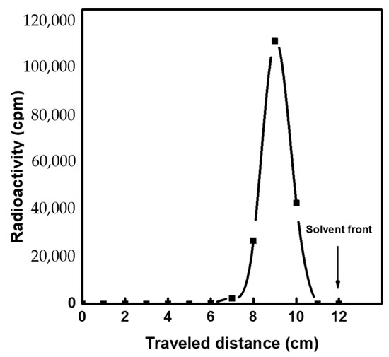 The radiochemical purity of the eluted 99mTc (percentage of 99mTcO4− to the total activity of the eluate) was determined by ascending paper chromatography using Whatman no. 1 paper and a mixture of (85% methanol + 15% H2O) as developing solvent. The radioactivity distributions were monitored using a γ-ray spectrometer to determine Rf. The measured radioactivity was plotted as a function of the traveled distance from the starting line. The value was calculated according to the following equation: