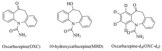 - Levert, H.; Odou, P.; Robert, H. LC determination of oxcarbazepine and its active metabolite in human serum. J. Pharm. Biomed. Anal. 2002, 28, 517–525. [Google Scholar] [CrossRef]