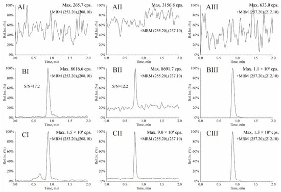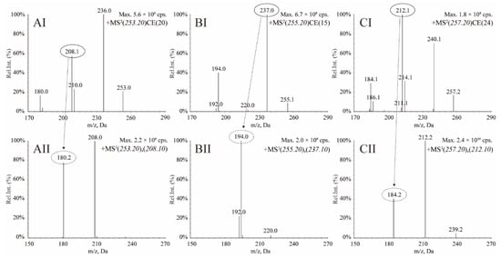 | MS3 transitions/MRM transitions (m/z) | 253.2→208.1→180.2 | 255.2→237.1→194.1 | 257.2→212.1→184.2 | 253.2→236.1 | 255.2→237.1 | 257.2→240.1 |
