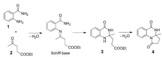 The reaction of anthranilamide (1) and ethyl levulinate (2) resulting in the formation of 2,3-dihydroquinazolin-4(1H)-one (3) and pyrrolo[1,2-a]quinazoline-1,5-dione (4) derivatives.