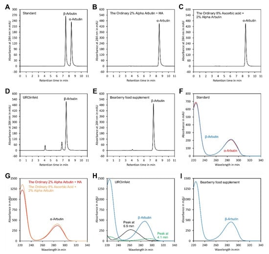 Analysis of samples. Chromatograms of (A) a standard containing authentic α-arbutin and β-arbutin; and samples of (B) The Ordinary Alpha Arbutin 2% + HA, (C) The Ordinary 8% Ascorbic Acid + 2% Alpha Arbutin, (D) UROinfekt for treatment of lower urinary tract infections and (E) bearberry extract food supplement. (F) Spectra of the α-arbutin and β-arbutin peaks of the standard. (G) Overlay of the spectra of the α-arbutin peaks from samples shown in (B,C). (H) Spectra of the β-arbutin peak and the peaks at 4.1 and 6.9 min from the sample shown in (D). (I) Spectra of the β-arbutin peak from the sample shown in (E). The original data are available in Supplementary Material File S9.