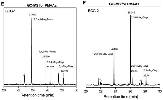 Similarly, the PMAAs of BCG-2 were identified as 1,5-di-O-acetyl-2,3,4,6-tetra-O-methyl-D-glucitol (2,3,4,6-Me4-Glc), 1,4,5-tri-O-acetyl-2,3,6-tri-O-methyl-D-glucitol (2,3,6-Me3-Glc), 1,5,6-tri-O-acetyl- 2,3,4-tri-O-methyl-D-glucitol (2,3,4-Me3-Glc), and 1,4,5,6-tri-O-acetyl-2,3-di-O-methyl-D-glucitol (2,3-Me2-Glc), with the molar ratio of 5.16:10.38:1.13:1.00 (Figure 1F, Table 1, and Figure S4, in the supplementary materials). These results indicated the presence of terminal 4-,6-, 4,6-linked Glcp residues.
