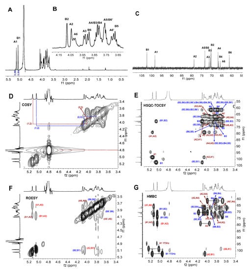 1H (A,B), 13C (C), COSY (D), HSQC-TOCSY (E), ROESY (F), HMBC (G) NMR spectra of BCG-1. Chemical shifts are relative to internal trimethylsilylpropionic acid sodium at 0 ppm. The letters A (maroon) and B (blue) represented 2,6-O-α-Manp (Residue A) and t-α-Manp (Residue B), respectively.