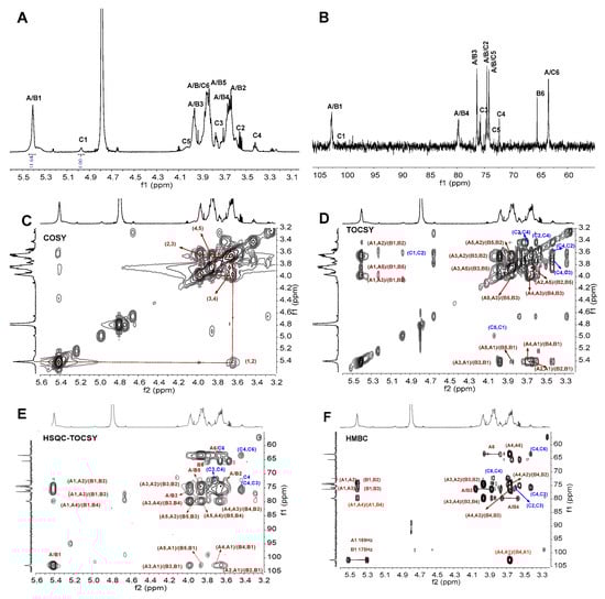 1H (A), 13C (B), COSY (C), TOCSY (D), HSQC-TOCSY (E), HMBC (F) NMR spectra of BCG-2. Chemical shifts are relative to external trimethylsilylpropionic acid sodium at 0 ppm. The letters A/B (maroon) represented →4)-α-Glc→1 (residue A)/→4,6)-α-Glc(1→ (residue B). The letters C (blue) represented t-α-Glc (1→ (residue C).