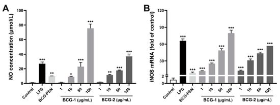 Effects of LPS, BCG-PSN, BCG-1, and BCG-2 on the production of NO (A) and mRNA expressions of iNOS (B) in RAW264.7 cells. LPS was at 100 ng/mL, BCG-PSN was at 87.5 µg/mL. * p < 0.05, ** p < 0.01, and *** p < 0.001 vs. control, one-way ANOVA, Dunnett’s multiple comparisons test.