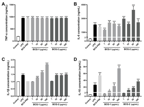 Effects of LPS, BCG-PSN, BCG-1, and BCG-2 on cytokines TNF-α (A), IL-6 (B), IL-1β (C), IL-10 (D) produced by the RAW 264.7 cells. LPS was at 100 ng/mL, BCG-PSN was at 87.5 µg/mL. * p < 0.05, ** p < 0.01, and *** p < 0.001 vs. control, one-way ANOVA, Dunnett’s multiple comparisons test.