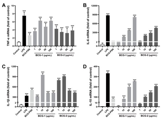 Effects of LPS, BCG-PSN, BCG-1, and BCG-2 on the mRNA expressions of TNF-α (A), IL-6 (B), IL-1β (C), IL-10 (D) in the RAW 264.7 cells. LPS was at 100 ng/mL, BCG-PSN was at 87.5 µg/mL. *** p < 0.001 vs. control, one-way ANOVA, Dunnett’s multiple comparisons test.