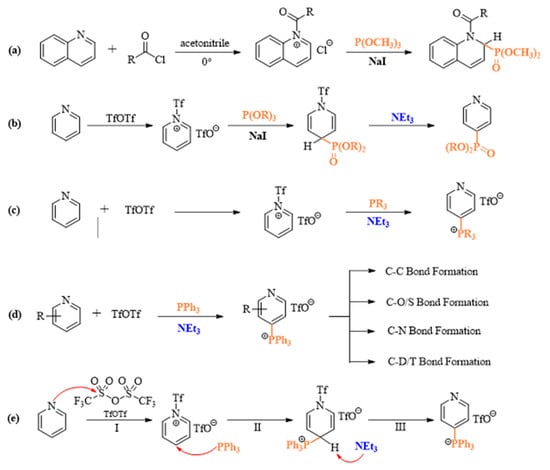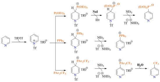 - Haase, M.; Goerls, H.; Anders, E. Synthesis of PO(OR)2− and PR3+-Disubstituted Pyridines via N-(Trifluoromethylsulfonyl)pyridinium Triflates. Synthesis 1998, 1998, 195–200. [Google Scholar] [CrossRef]