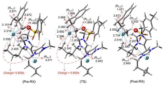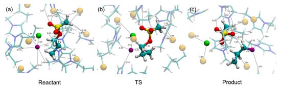 An alternative model would be the mixed quantum and molecular mechanical (QM/MM) simulation method in which the IL molecules in indirect interaction with the QM-treated part of the system are treated by MM methodology. Recent excellent simulations by Gallo and co-workers [] are to be noticed in this regard. Figure 7 depicts the structures of the reactant, TS, and product for SN2 fluorination in [Bmim][Br]. On average, five IL units were calculated to surround the contact ion-pair KF. Thus, Gallo and co-workers’ QM/MM simulation clearly illustrates that the metal salt KF reacts as a contact ion pair nucleophile in [Bmim][Br], in line with Lee and co-worker’s theory []. The calculated Gibbs free energy of activation ΔG‡ of 22~24 kcal/mol [] for the reactions in five IL solvents are comparable to those obtained by the supramolecular–continuum approach.
