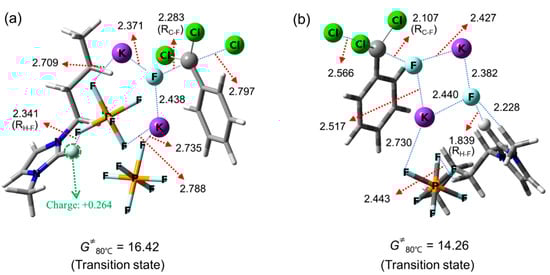 Calculated transition state of SN2 fluorination in [bmim][PF6] (a) activated by KPF6 with substrate:KF:KPF6 = 1:1:1 and (b) with substrate:KF = 1:2.