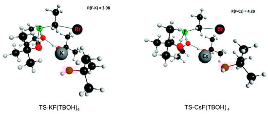 Several theoretical methods have been employed to treat the promotion of nucleophilic fluorination in ILs. Since the ILs are in a liquid state, however, some simplifying models should have been adopted. One choice was the supramolecule (cluster)–continuum approach, in which the IL molecules directly interacting with the substrate/metal fluoride are treated by full quantum chemical methods (mostly based on density functional theory (DFT)), whereas the rest of the infinite number of IL molecules are as continuum. The biggest merit of this approach is simplicity, and it is good for obtaining and comparing the relative Gibbs free energies of alternative reaction paths, providing the essential features of the reaction processes. Pliego [,] employed the molecular dynamics simulation combined with (cluster)–continuum approach to treat bulky alcohols as reaction medium for SN2 nucleophilic fluorination, specifically for the solvation of alkali metal salts and the transition states in tert-butanol solution. The author found that the transition state was solvated by a cluster of four tert-butanol molecules and by a dielectric continuum (Figure 6). The free energy of activation obtained by cluster–continuum calculations for CsF reaction with ethyl bromide was 28.4 kcal/mol, close to the experimental value of 28.9 kcal/mol for a similar system. This technique also seems to be promising for SN2 reactions in ILs for calculating and comparing the Gibbs free energies of activation to estimate the efficacy of promoter/catalysts and also to compare the relative feasibility of alternative reaction pathways, as demonstrated by Lee and co-workers in a series of works [,,]. For the supramolecule (cluster) part of the system, it would be prerequisite to accurately calculate the weak interactions (hydrogen bonding, specifically). Thus, DFT-based methods with such capability such as M06-2X [] would be desirable. A number of polarizable continuum methods (PCM) may be used for the treatment of solvent continuum, but the SMD method [] was quite adequate in terms of computational cost and accuracy.