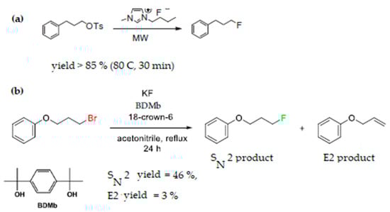 Two examples of nucleophilic fluorination (a) solvent free nucleophilic introduction of fluorine with [bmim][F], Ref. [] (b) nucleophilic fluorination with KF catalyzed by 18-Crown-6 and bulky diols, Ref. [].