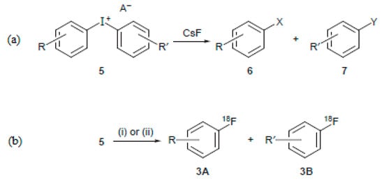(a) Cold fluorination using CsF in CH3CN; (b) hot fluorination of diarylio donium salts using (i) [18F] K+-APE 2.2.2 under N2 at 85 °C 40 min and (ii) [18F]F− Cs+, in CH3CN under N2 at 85 °C, 40 min.