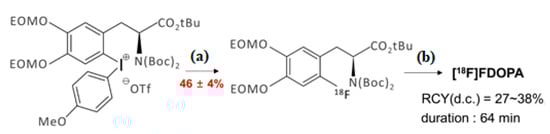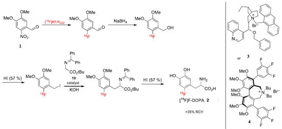 - Edwards, R.; Wirth, T. [18F] 6-fluoro-3, 4-dihydroxy-l-phenylalanine–Recent Modern Syntheses for an Elusive Radiotracer. J. Label. Compd. Radiopharm. 2015, 58, 183–187. [Google Scholar] [CrossRef] [PubMed]