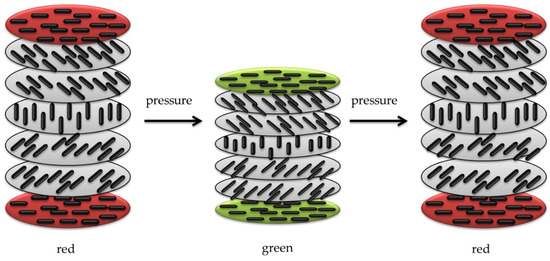- Piezochromism, based on pressure stimuli. Piezochromic compounds are mostly prepared from conjugated polymeric materials. The color-changing property in the solid state is typical of three classes of compounds, namely, polydiacetylenes, polythiophenes, and polysilanes. Pressure and compression cause perturbations of the ground and excited states, changes in the crystal structure through first-order phase transitions, or changes in the molecular geometry in species that comprise the solid [148].