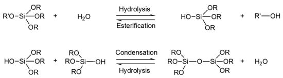 - Vasiljević, J.; Tomšič, B.; Jerman, I.; Simončič, B. Organofunctional Trialkoxysilane Sol-Gel Precursors for Chemical Modification of Textile Fibres. TEKSTILEC 2017, 60, 198–213. [Google Scholar] [CrossRef]