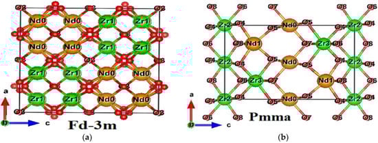 where is ETOT, E1, E2, and E3 are the total energy of the Nd2Zr2O7 system, for the Nd atom, for the Zr atom, and for the O atom. The binding energy formation values for Fd-3m and Pmma were −3.860 and −3.074. If a compound has negative binding energy, it is considered as thermodynamically stable. It is evident that our investigated materials were thermodynamically stable as they had negative values of formation energy. Fd-3m had the lowest value, indicating a more thermodynamically stable material.