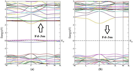 Energy band structure of Nd2Zr2O7 compound in Fd-3m phase for (a) the spin-up direction (↑) and (b) spin-down (↓) direction.