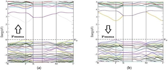 Energy band structure of the Nd2Zr2O7 compound in the Pmma phase for the (a) the spin-up direction (↑) and (b) spin-down (↓) direction.