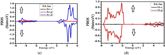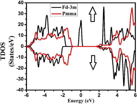 The TDOS (Figure 4) for both symmetries of the compound exhibited well-known energy regions in the valence band (VB) from −5.0 eV to −2.0 eV for the Fd-3m phase, while for Pmma it extended from −6.0 eV to −1.0 eV for both the spins, with a well-defined peak observed at 0.0 eV for Fd-3m phase. The VB was formed by the hybridization of the three atoms in the compounds, whose contributions can be found from the plots of PDOS in Figure 5 and Figure 6. The conduction bands (CB) extending from 2.0 eV to 6.0 eV for both the phases and both the spins were formed due to the hybridization of the three species.
