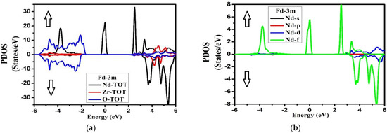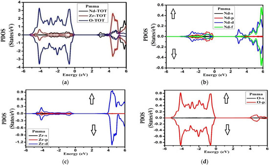 From the plot of PDOS in Figure 5, we can see that, for the Fd-3m phase, the two peaks at −4.0 to −3.0 eV and at Fermi level originated from the Nd-f electronic states for the spin-up case. A large part of VB from −5.0 eV to −2.0 eV appeared due to O-p states. Meanwhile in CB, a prominent peak appeared at 2.5 eV from Nd-f states in the spin-up case too. From energy region 3.0 eV to 6.0 eV, the main contributions in the conduction band also arose from Nd-f states in the spin-down case with some considerable contribution from Zr-d states for both up and down spin cases. However, for the Pmma phase, the main contribution in VB was due to O-p states extending from −5.0 eV to −0.5 eV, as shown in Figure 6. The CB was mainly formed from Nd-(d + f) and Zr-d states extending from 4.0 eV to 6.0 eV with equal weightage from both spin states. The hybridization showed the strong covalent bonding between the species. This aspect suggests that there was a very strong electronic interaction between Nd-f, Nd-d, and Zr-d atomic orbitals. The considerable role of Nd-f and Zr-d beneath the Fermi level showed that it can donate the electrons. The contribution of the lower group of the conduction band was mostly due to Nd-f, Zr-d, and Zr-p orbitals, while in the Pmma phase, the peaks were generally due to Nd-d, Zr-d, and Zr-p electronic orbitals. The most important thing is that we have investigated the arrangement of the orbitals for all the nonequivalent locations for each element in the Fd-3m and Pmma phases of the Nd2Zr2O7 compound and important differences between the two phases have been noted. From this investigation, it has been ascertained that the peaks in the Fd-3m phase were higher than the Pmma phase and the structure moved to higher energies as we shifted from the Fd-3m phase to the Pmma phase. For Fd-3m phase, the valance band was mostly due to Nd-f states, while on the other hand, for Pmma, phase, it was due to Nd-d and Zr-d electronic orbitals.