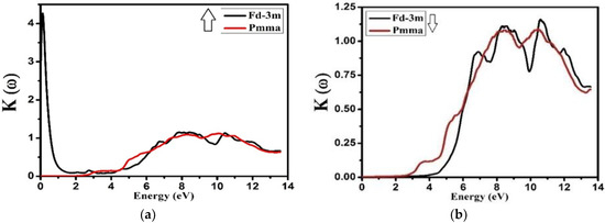 Calculated extinction coefficient K(ω) for Nd2Zr2O7 ((black color for Fd-3m) and (red color for Pmma)) using GGA+U. (a) The spin-up direction (↑) and (b) spin-down (↓) direction.