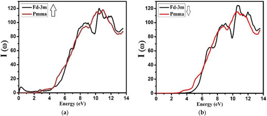 Calculated absorption coefficient I(ω) of Nd2Zr2O7 ((black color for Fd-3m) and (red color for Pmma)) using GGA+U. (a) The spin-up direction (↑) and (b) spin-down (↓) direction.