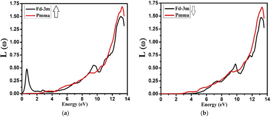 Calculated energy-loss function L(ω) for Nd2Zr2O7 ((black color for Fd-3m) and (red color for Pmma)) using GGA+U. (a) The spin-up direction (↑) and (b) spin-down (↓) direction.