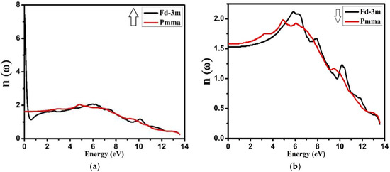 Calculated refractive index n(ω) for Nd2Zr2O7 ((black color for Fd-3m) and (red color for Pmma)) using GGA+U. (a) The spin-up direction (↑) and (b) spin-down (↓) direction.