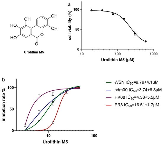 In vitro activities of urolithin M5 were identified by plaque reduction assay. Urolithin M5 inhibited four IAV strains in a dose-dependent manner, and CC50 (a) and IC50 (b) values were calculated by Graphpad Prism 6.0.