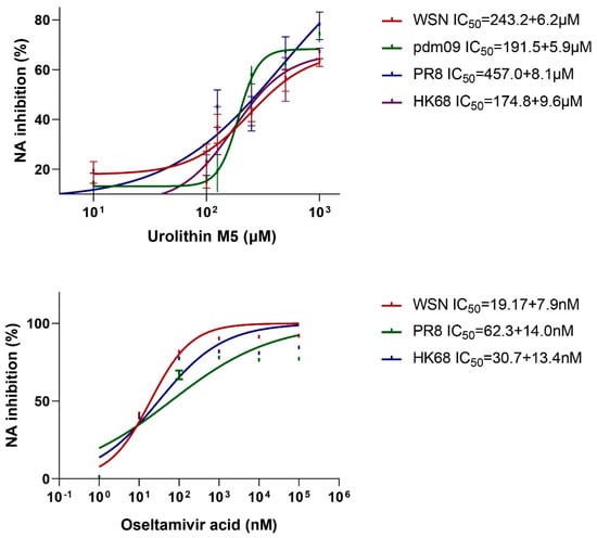 Assay of urolithin M5 on NA inhibition. Oseltamivir acid was used as positive control with an IC50 of 19.17 nM (WSN), 62.3 nM (PR8) and 30.7 nM (HK68). The experiments were repeated three times for confirmation.