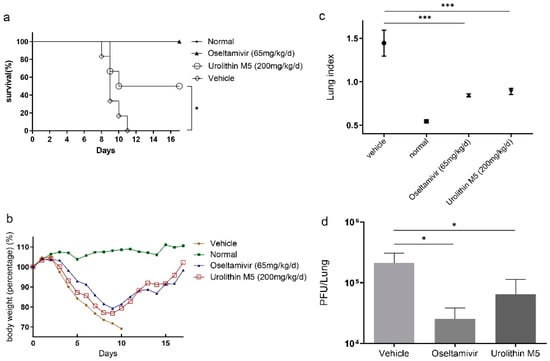 Urolithin M5 exhibited antiviral activities in PR8-infected mice. PR8-infected mice were administrated orally with 200 μL of 200 mg/kg/d urolithin M5, 65 mg/kg/day oseltamivir or 0.5% CMC for 6 consecutive days. (a) Body weights and (b) survival rate are shown. The efficacy of urolithin M5 and oseltamivir treatment on (c) lung index and (d) lung viral load of mice are shown. Six mice of each group were measured, and each assay was performed three times for confirmation. (* p 0.05, *** p 0.001).