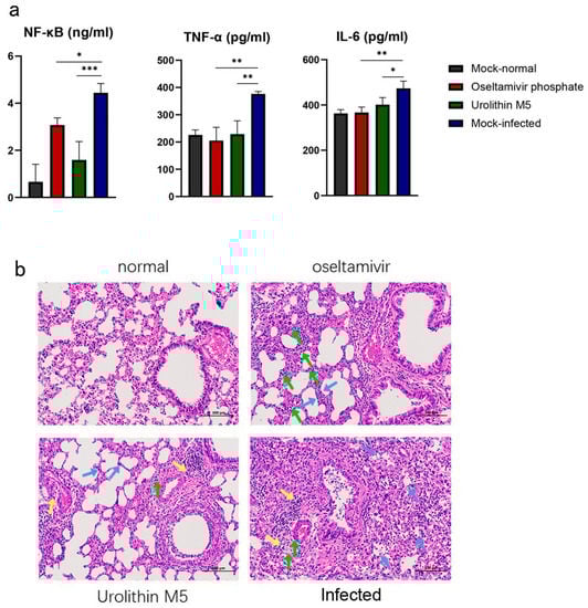 (a) Effect of urolithin M5 treatment on NF-κB, TNF-α and IL-6 levels using ELISA assay. (b) Histopathologic changes of mice from the normal group, oseltamivir group, urolithin M5 group, and vehicle group on the fourth day. Inflammatory changes are labeled as interstitial expansion (green arrow), small vessel inflammatory cell infiltration (yellow arrow), and alveolar lumen inflammatory cell infiltration (blue arrow) (magnification: 200×). (* p 0.05, ** p 0.01, *** p 0.001).
