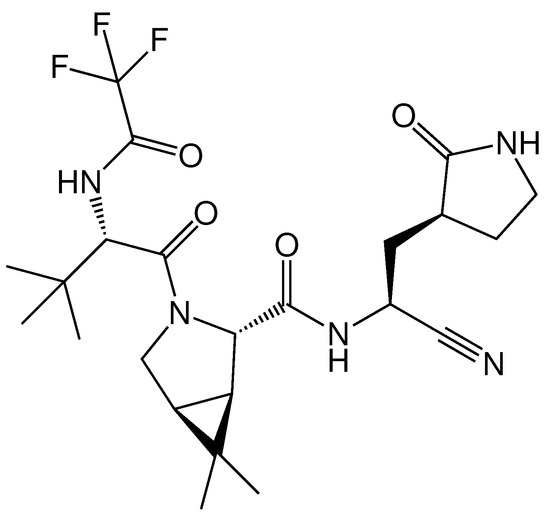 - Owen, D.R.; Allerton, C.M.N.; Anderson, A.S.; Aschenbrenner, L.; Avery, M.; Berritt, S.; Boras, B.; Cardin, R.D.; Carlo, A.; Coffman, K.J.; et al. An oral SARS-CoV-2 M<sup>pro</sup> inhibitor clinical candidate for the treatment of COVID-19. Science 2021, 374, 1586–1593. [Google Scholar] [CrossRef]