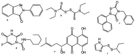 Non-specific promiscuous SARS-CoV-2 M inhibitors: (a): Ebselen; (b): Disulfiram; (c): Tideglusib; (d): Carmofur; (e): Shikonin; and (f): PX-12.
